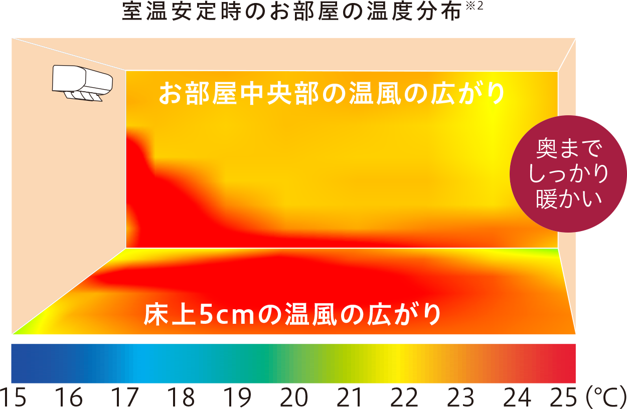 ※3 当社独自の条件(製造元)により評価。当社試験室(製造元)で測定。RAS-XR4026D。設定風速急速パワフルで暖房運転。ピーク風速0.2m/s以上となる距離15m。設置環境や使用状況、機種により到達距離は異なります。