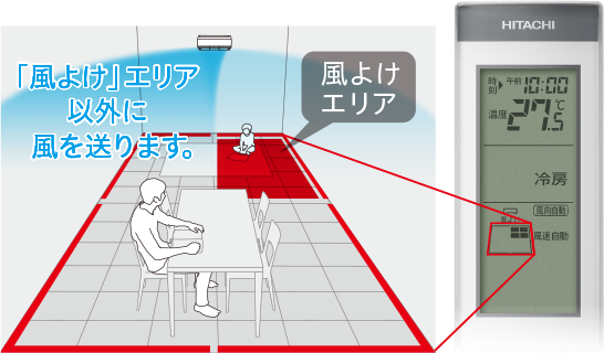 ひとつのエリアを「風よけ」エリアに選択すると、そのエリアへの送風を避けながら気流をコントロールします。