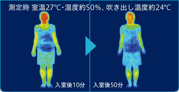 ※当社試験室(製造元)で測定。評価。[涼快]運転:設定温度27℃・設定湿度約50%、冷房運転:設定温度27℃。洋室10畳。室外温度33℃・湿度80%に設定。設置環境、使用状況により、効果は異なります。
