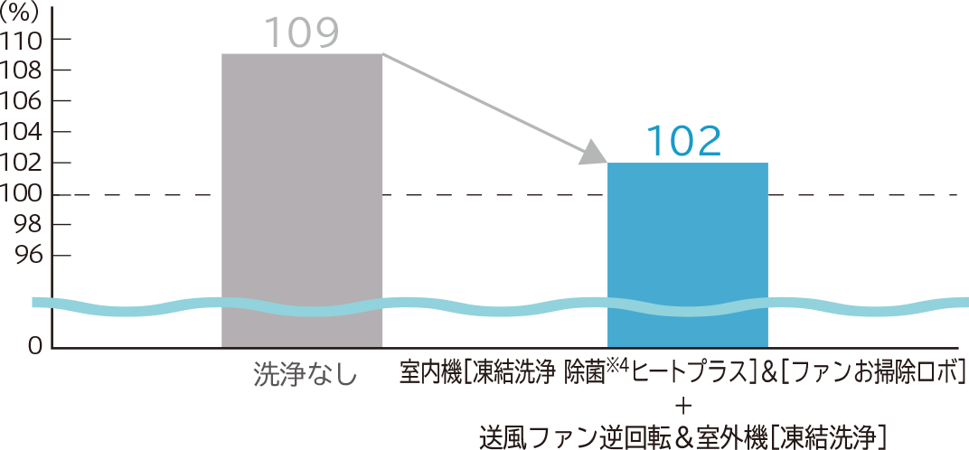 汚れによる風量低下を室外機で約13%低減し、能力の低下を抑えます。