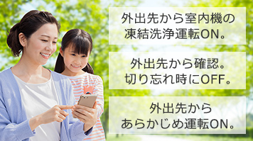 スマートフォンに専用アプリをインストールすれば、いつでもどこでもエアコンの操作や運転状態の確認ができます。