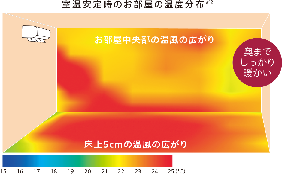 大きなフラップにより温風を足もとに届け、広いリビングでもお部屋の奥までしっかり暖めます。