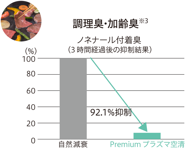 ※3 試験機関:(一財)北里環境科学センター。試験室約30m3。試験方法:吹き出し口から約1.5mの位置にニオイ成分を付着させた布片を吊るし、Premiumプラズマ空清運転実施。6段階臭気強度表示法および検知管法により検証。試験結果:付着した疑似調理臭・加齢臭(ノネナール)を3時間で92.1%(臭気強度1.1)低減。トリメチルアミン(生ごみ、ペット臭)を4時間で96.8%(臭気強度1.5)低減、酢酸(体臭、靴下臭)を4時間で61.2%低減。臭気強度が1下がることは、90%低減に相当します。