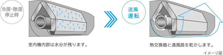 冷房・除湿運転後に、自動で約2時間の送風運転を行い、室内機内部の水分を乾燥させます。