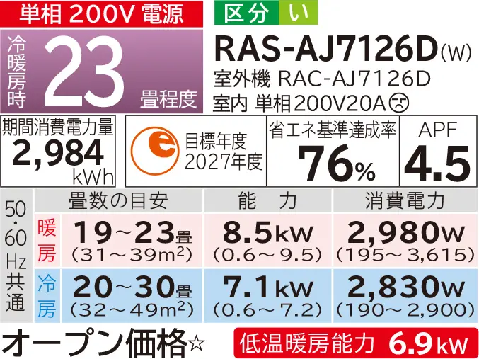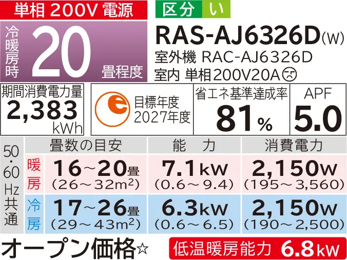 | 型式 | RAS-AJ2226S | RAS-AJ2526S・AJ2826S・AJ2826D・AJ3626S・AJ3626D・AJ4026S・AJ4026D・AJ5626D | RAS-AJ6326D・AJ7126D | |