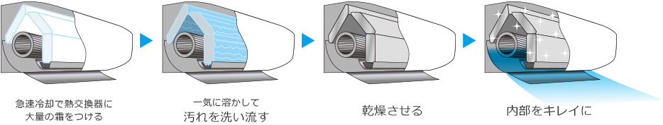 熱交換器を凍らせ、たくわえた霜を一気に溶かし、汚れを洗い流します。清潔な状態にし、ホコリの目詰まりによる性能の低下も抑えます。