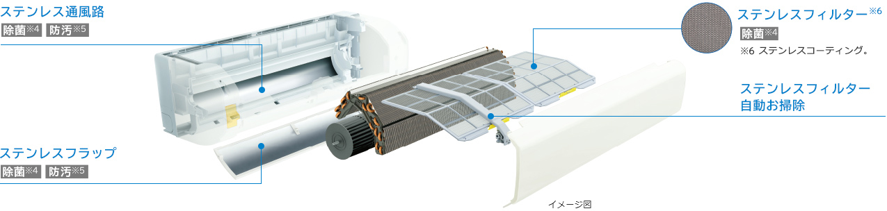室内熱交換器は親水性コーティングにより、冷房・除湿時に発生した水がフィン表面になじんで流れやすくなり、汚れを付きにくくしています。