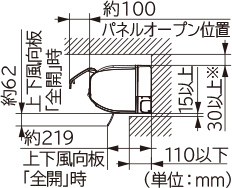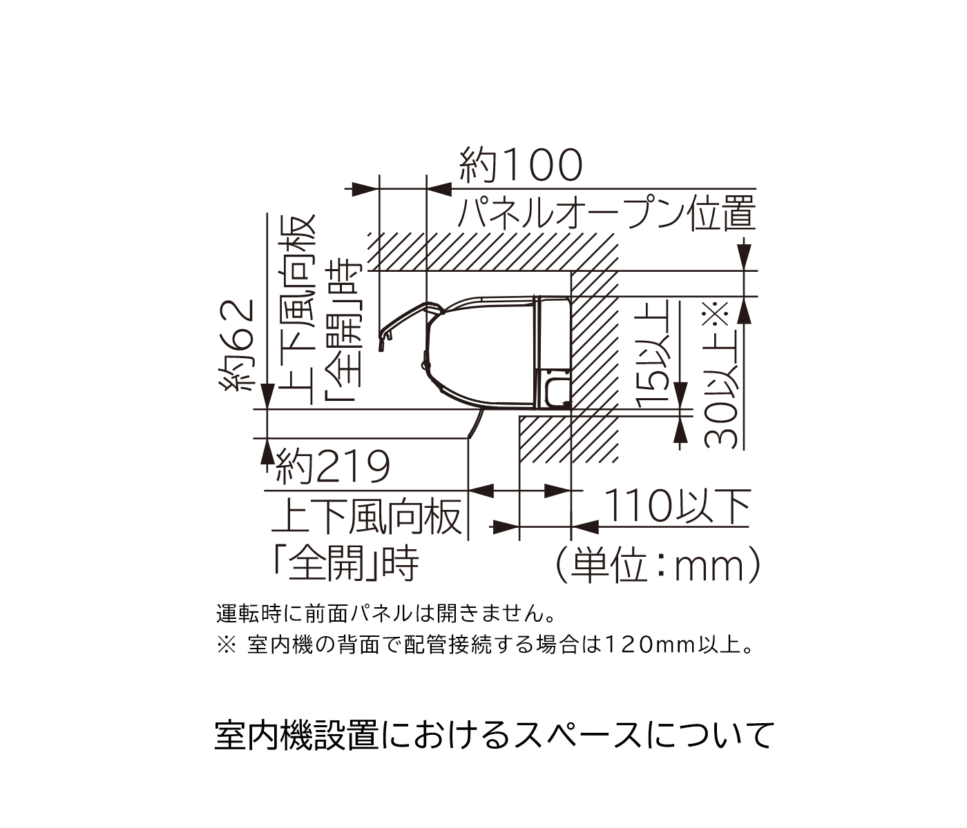 ※設置には左右にも50mm以上のスペースが必要です。 *室内機背面で配管接続する場合は、上面隙間120mm以上必要です。