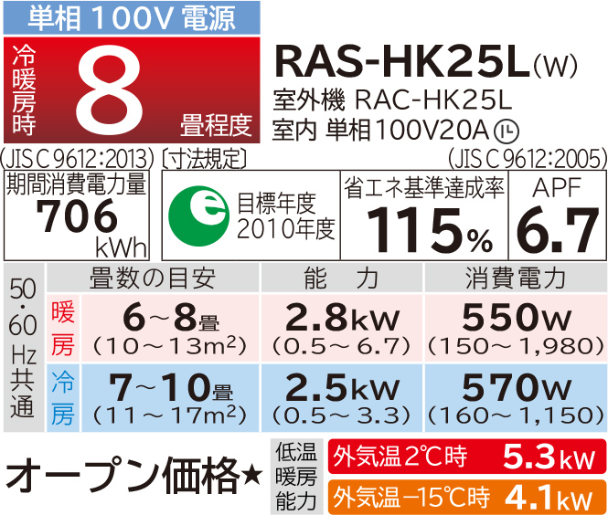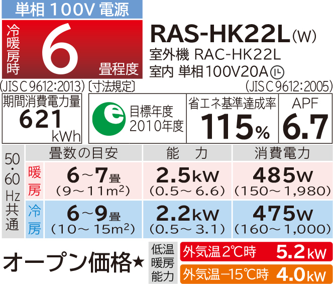 低温暖房能力とは、外気温の低い時(外気温2℃時:JIS低温条件時)の暖房能力です。暖房能力を重視する時には、これも目安にお選びください。