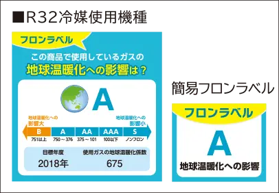 このラベルは、フロン排出抑制法に基づく指定製品に使用されている冷媒フロンの環境影響度として用いられている地球温暖化係数(GWP)について、定められた目標への達成度を表したものです。製品を選択する時のご参考にしてください。家庭用エアコンは、出荷台数で加重平均した環境影響度として用いられている地球温暖化係数(GWP)の値が、目標年度(2018年)において目標値(750)を上回らないことが、製造事業者等に義務付けられております。