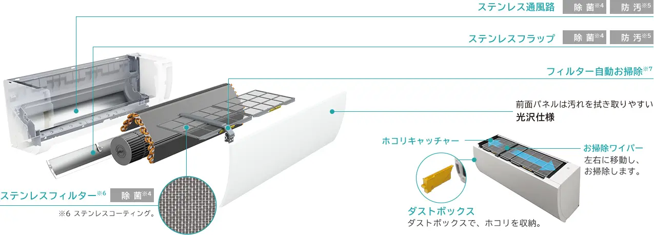 ※7 フィルターを自動でお掃除しても、使用状態や環境により、フィルターの汚れが取れないことがあります。しつこい油汚れなど、汚れが気になる時は、定期的にフィルターを取りはずしてお手入れをしてください。