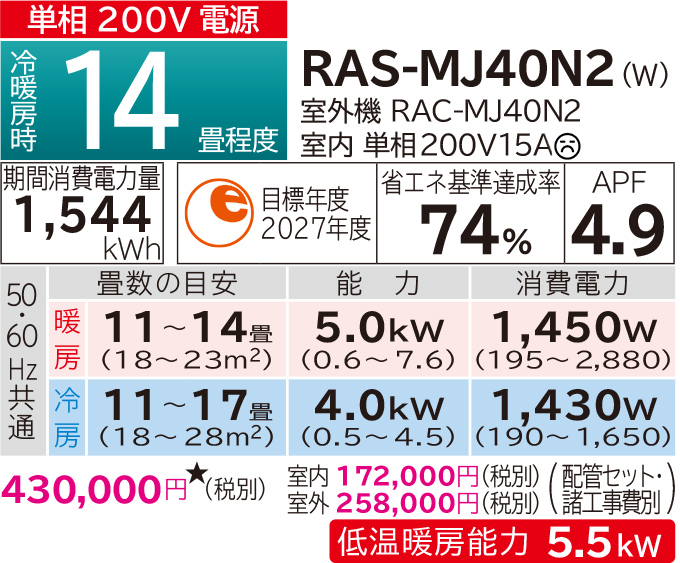 ※RAS-MJ40N2において、日立独自の条件(製造元)により評価しています。