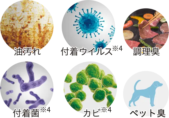 ※油汚れ、ウイルス、菌、カビ等をすべて洗い流せるものではありません。設置環境、使用状況により効果は異なります。常時発生し続けるニオイ成分はすべて除去できるわけではありません。