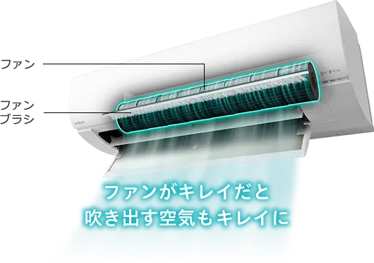 熱交換器の奥にあり、今までお掃除できなかったファン。ホコリがたまりやすい羽根の先端も定期的にお掃除します。さらにファンを加熱することで、油を含んだホコリまでしっかり除去。ブラシで落としたホコリは熱交換器の汚れとともに洗い流します。