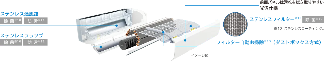 ※11 防汚効果はプラスチック素材とステンレスとの比較。当社試験室(製造元)で測定。JIS粉体8種・11種混合。約8時間送風運転した結果のホコリ付着量。ステンレスに防汚効果あり。