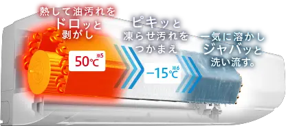 室外熱交換器に付着した小さなホコリを凍らせ、たくわえた霜を一気に溶かし洗い流します。ホコリの目詰まりによる性能の低下も抑えます。