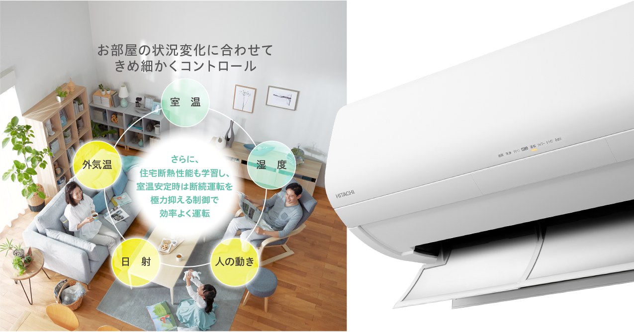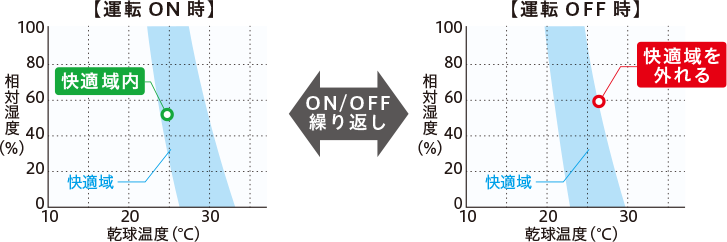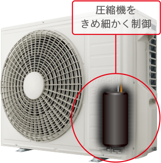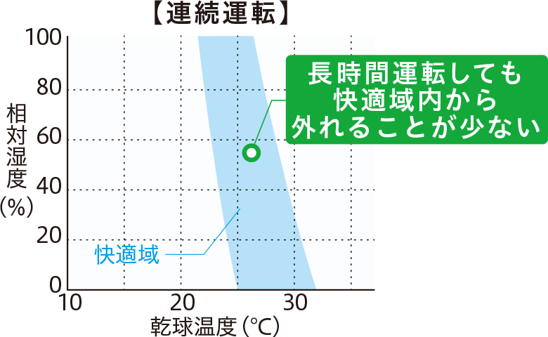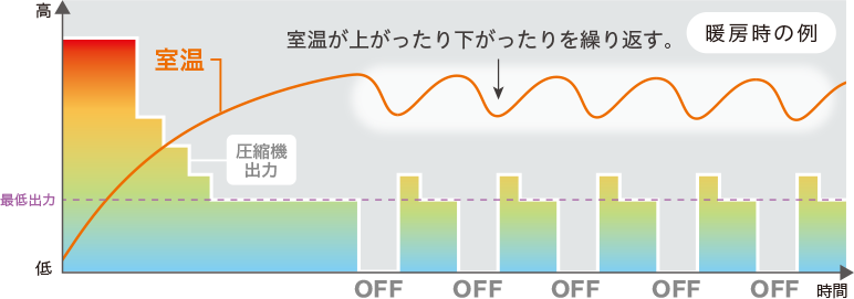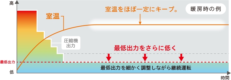 設定温度に達した後は、出力を抑えて継続的に運転。室温の上下の変化も少なく、快適を持続させます。