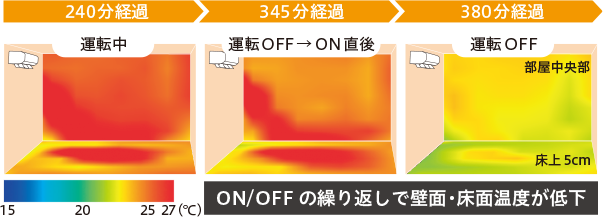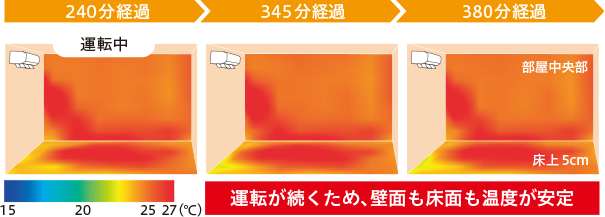 圧縮機が出力を抑えた運転を継続することで床面付近を含めたお部屋全体の温度が長時間安定。