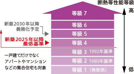 2050 年カーボンニュートラルの実現に向けて、国は「断熱等性能等級」を定め、2025年から新築住宅には等級4以上の適合が義務化されました。この流れを受けて開発された[LAB制御]は、今後増加が見込まれる高断熱住宅にも対応したルームエアコンとして、節電と快適性を両立する空調制御技術です。