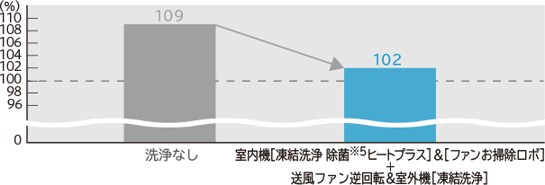 ※4 当社調べ(製造元)。当社試験室(製造元)での実証結果による一例。RAS-XJ4026D。JIS C 9612:2013に基づくAPFから算出された期間消費電力量は、新品を100とした場合の比率を記載。室内機のホコリは、1年分のホコリ量1.2g(当社調べ(製造元))から得られる7年相当分のホコリ量。室外機のホコリは、7年間使用した室外機のホコリ量。当社独自の条件(製造元)に基づくものです。使用状態や環境により異なります。