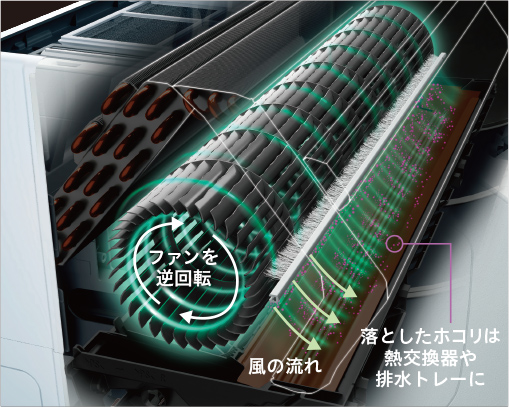 ファンを逆回転させ、ブラシで落としたホコリは熱交換器の汚れとともに洗い流します。