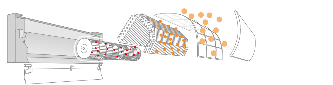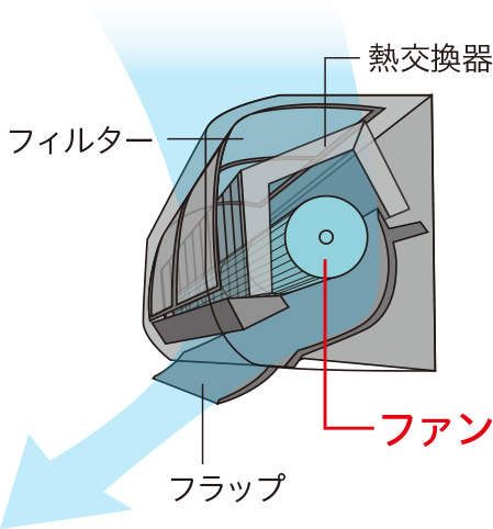 ファンが回転しフィルターを通して入った空気をフラップから送り出します。
