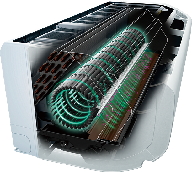 リモコンの[凍結洗浄]ボタンを押すと、フィルター自動お掃除、熱交換器や排水トレーの[凍結洗浄 除菌※1ヒートプラス]、ファン自動お掃除までを一気にまとめて行います。暖房や冷房シーズン中に汚れが気になるときや、エアコンを長く使用しなかったときも、ワンボタンで内部を清潔な状態に。