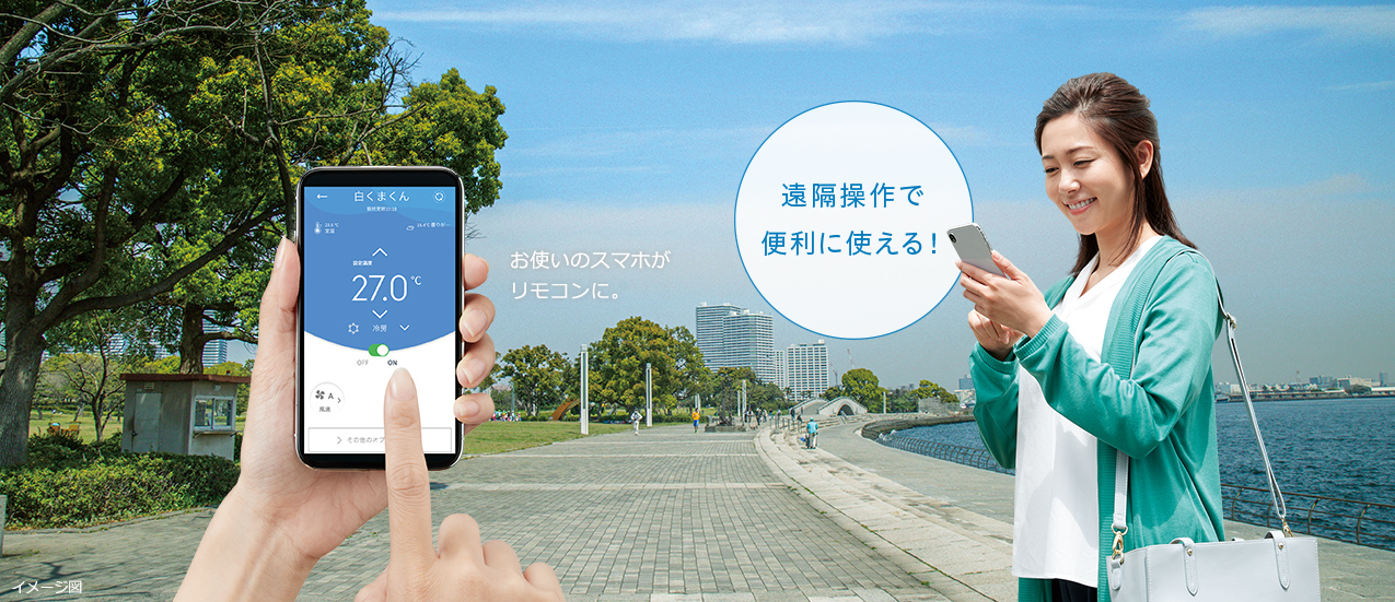 ●アプリ対応機種はAndroid™ 8.0以上のスマートフォン、iOS10.0以上のiPhone。 ●サービスのご利用に当たっては、専用アプリのダウンロード(AndroidスマートフォンはGoogle Play、iPhoneはAppStore)が必要です(アプリは無料です。) ●専用アプリのダウンロードならびにサービス利用にあたっては別途通信費がかかります。 ●通信状況が悪い場合には、ご利用できません。 ●「白くまくんアプリ」「白くまくん 音声操作」のサービス内容・スマートフォンの画面デザインおよび仕様は予告なく変更することがあります。 ●インターネット回線はブロードバンド回線(常時接続)が必要です。 ●AndroidはGoogle LLC の商標または登録商標です。iPhoneはApple Inc.の商標です。 ●乳幼児・お子様・お年寄り・病気の方・体の不自由な方など、ご自身でエアコンの操作ができない方が在室している場合は、管理できる人が近くにいるときに本操作をご使用ください。