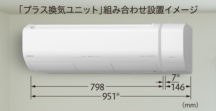 ※1 前提条件:RAS-XJ40N2にプラス換気ユニットを装着。JIS B 8330測定基準における1時間あたりの換気能力(実測値)。有効換気風量47m3/h。日立調べ(製造元)。 ●排気方式。「パワフル」運転時風量:47m3/h。測定条件:工業会基準(JIS B 8330準拠)による。ホースの長さ:0.5m、ホース形態:後直引き。Φ25排気ホース使用時。ホース折り曲げ回数2回。虫除けカバー、雨除けフード付き。「パワフル」運転時消費電力:約42W。●大気解放状態での測定のため、設置条件、部屋での使用条件等によっては、風量が低下します。 ●排気風量測定基準Φ25ホース長の0.5mから、ホース長が増える場合、排気風量が低下します。(Φ25ホース最大長1.5m時:約25%低下) ●室内の空気を外に排出する排気式の換気運転を行います。●「換気機能」は、燃焼器具を使用するときの換気に使わないでください。 ●排気風量を強く設定すると、送風音も大きくなります。 ●換気時の運転音は、冷暖房時の最大運転音から4.0kWで弱時0.5dB以下、パワフル時3dB程度アップします。 ●使用環境によって、室温、湿度の変化が大きくなる場合があります。 ●室温や外気温、運転状況により、換気風量や室内の空気の入れ換えにかかる時間は変わります。 ※プラス換気ユニットのフィルターは、お客様ご自身によるお手入れが必要です。