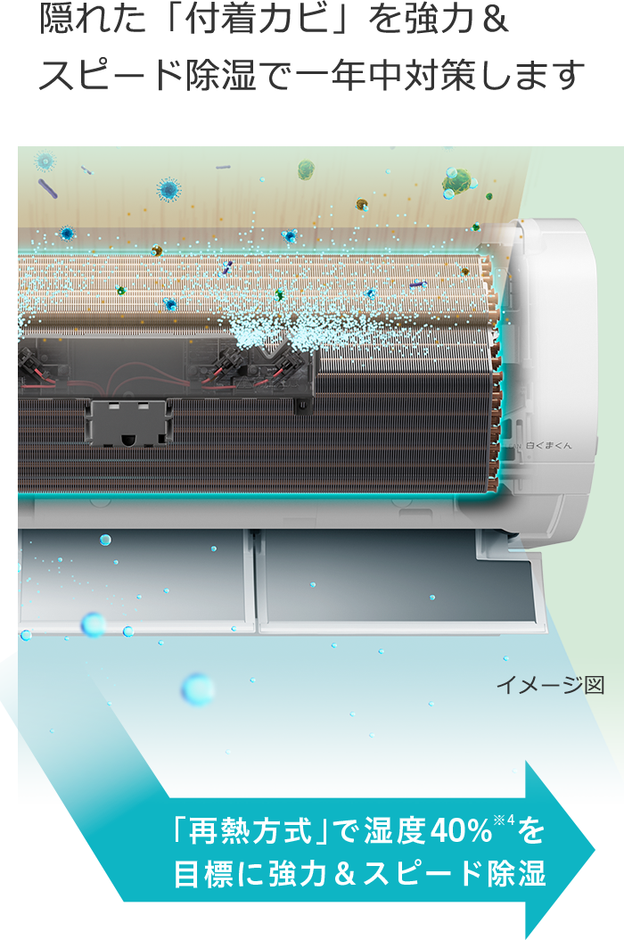 ※4 除湿運転時に「パワフルPremiumプラズマ空清」を設定すると湿度40%を目標に運転します。使用する条件により、湿度40%にならないことがあります。