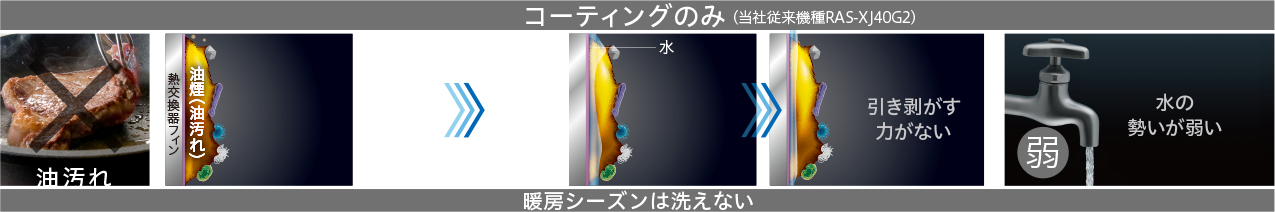 ※油汚れ、疑似ホコリを熱交換器に直接付着させた実験画像です。設置環境、使用状況により効果は異なります。