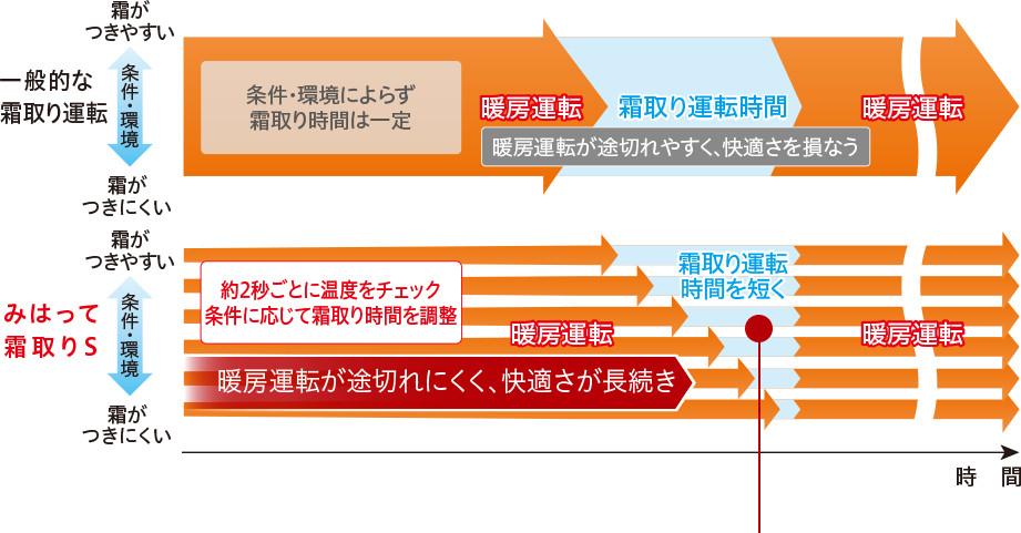 室外熱交換器の温度と外気温を、約2秒に1回というきめ細かさでチェック。暖房を可能な限り継続し、必要な時だけ霜取り運転を行うことで、暖かさを長続きさせます。