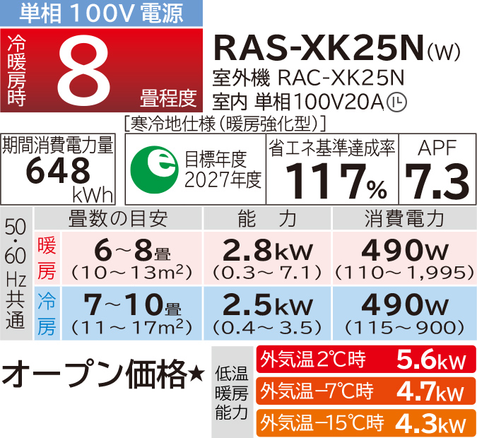 低温暖房能力とは、外気温の低い時(外気温2℃時:JIS低温条件時)の暖房能力です。暖房能力を重視する時には、これも目安にお選びください。