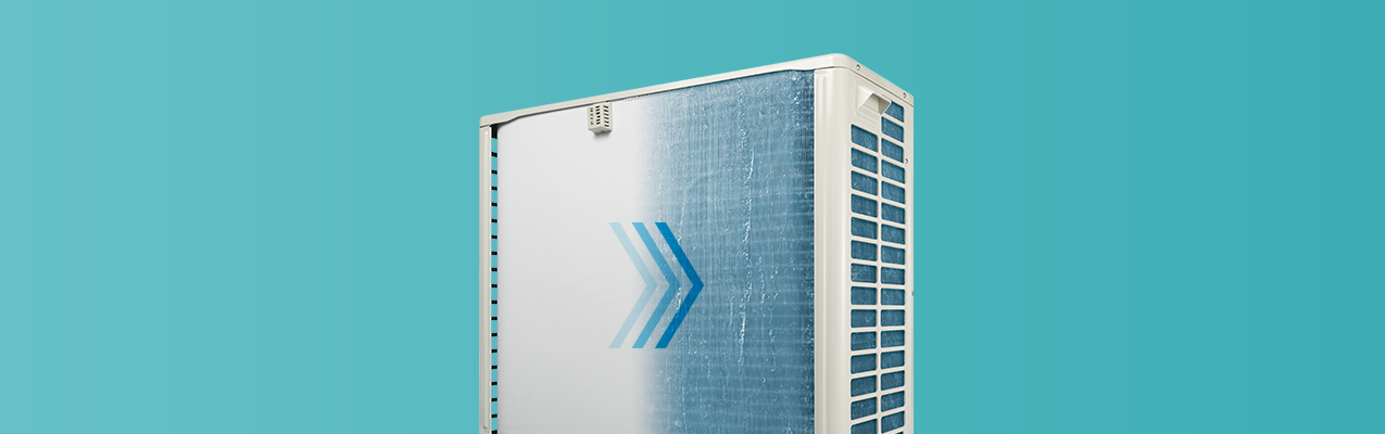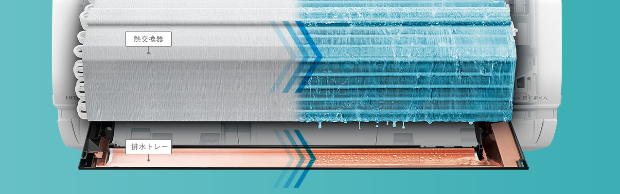 室内熱交換器は親水性コーティングにより、冷房・除湿時に発生した水がフィン表面になじんで流れやすくなり、汚れを付きにくくしています。