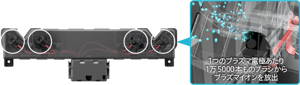 従来のエアコン吹き出し口のイオンを放出する電極に加え、エアコンの吸い込み口の4個の電極からプラズマイオンをワイドに放出する発生器を新搭載。放出量が増え、吹き出し口と吸い込み口の2か所に配置したことで、捕集力がアップしました。