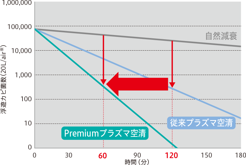 ※3 試験番号:北生発2022_0206号。試験方法:25m3の密閉試験室内に浮遊カビを噴霧し、空気を循環させた後、エアコンを稼動させながらPremiumプラズマ空清を運転させ、浮遊カビの数を経時的に測定。浮遊カビの除去効果 (60分後の減少率99%以上)。
