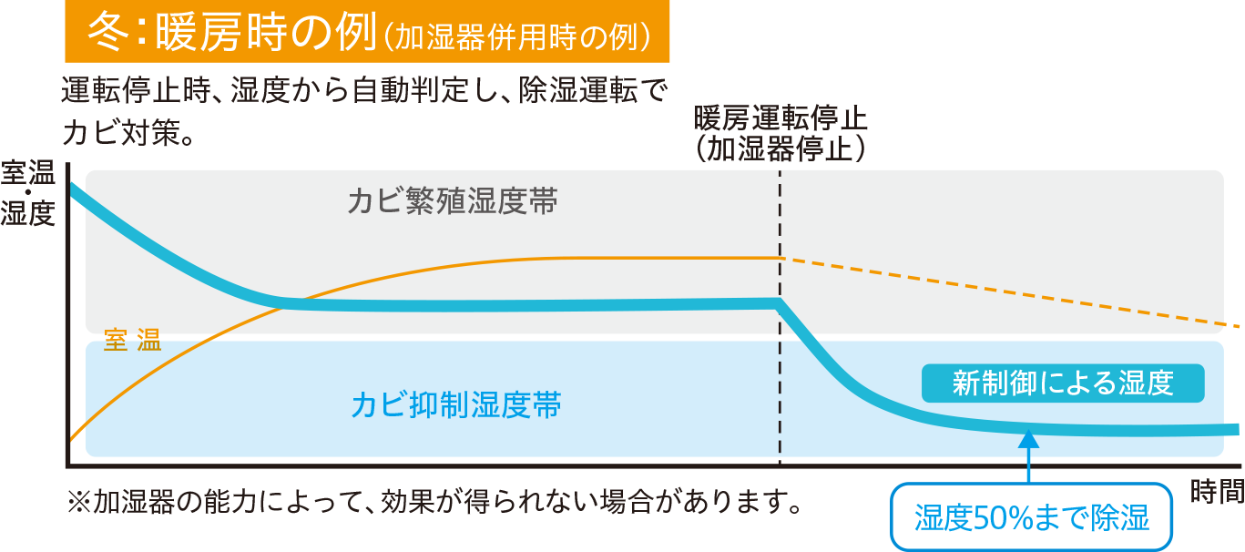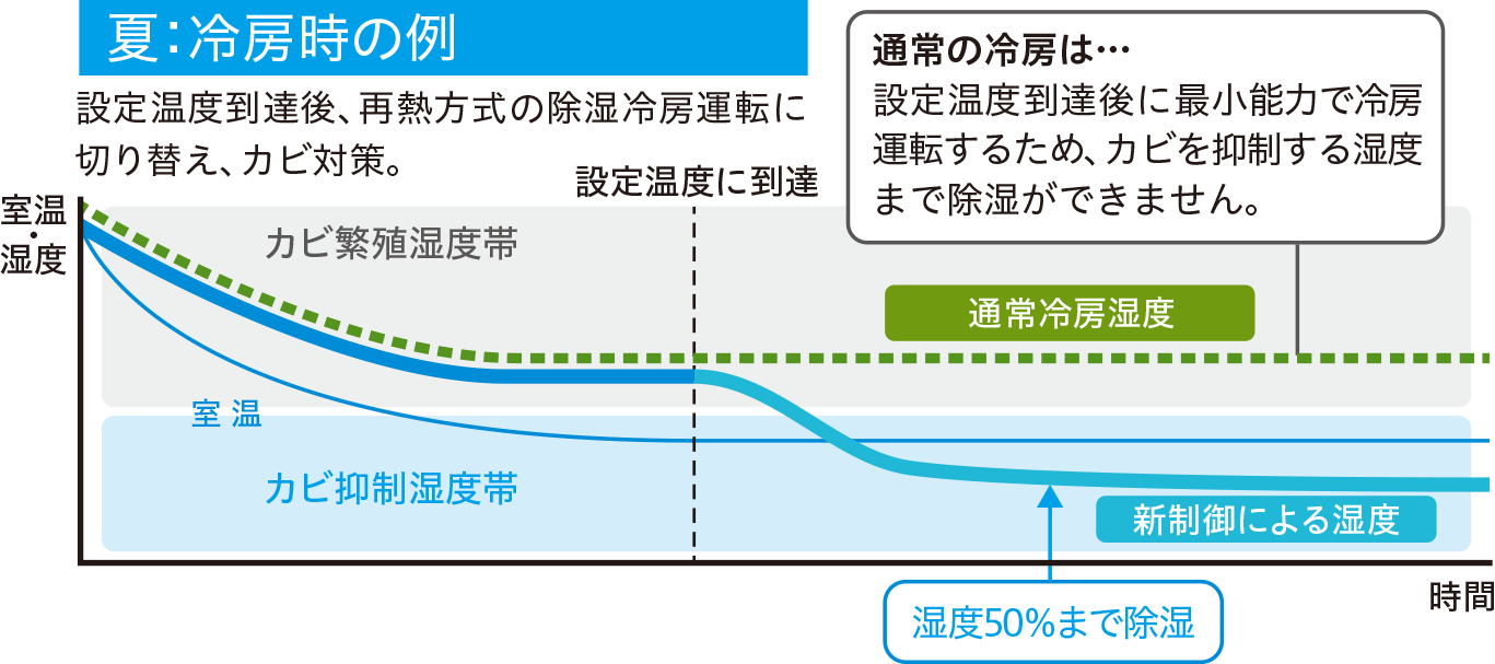 「再熱方式」の除湿で、お部屋の湿度をしっかりスピーディーに下げることで、風が届かない場所の湿度も下げ、隠れているカビを一年中対策します。