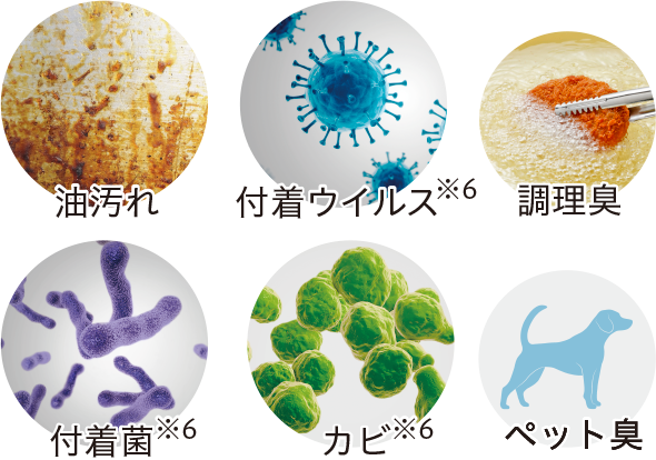 ※油汚れ、ウイルス、菌、カビ等をすべて洗い流せるものではありません。設置環境、使用状況により効果は異なります。常時発生し続けるニオイ成分はすべて除去できるわけではありません。