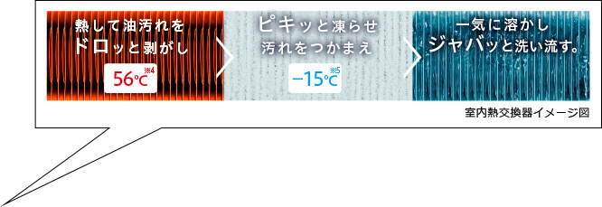 室内熱交換器を熱して油汚れの粘着力を低下させ、凍らせ、たくわえた霜を一気に溶かし、汚れを洗い流します。清潔な状態にし、ホコリの目詰まりによる性能の低下も抑えます。