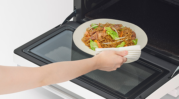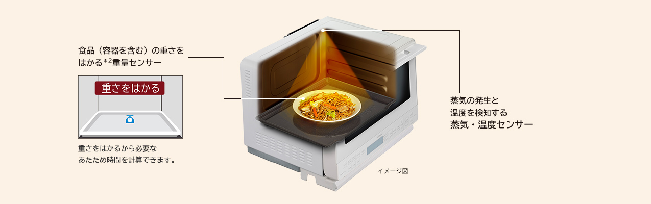 重さをはかるから、レンジ加熱後はもちろんオーブン調理後など庫内の温度が高くても、続けてオートのあたためが可能です。