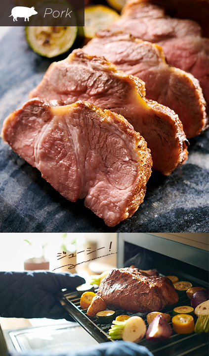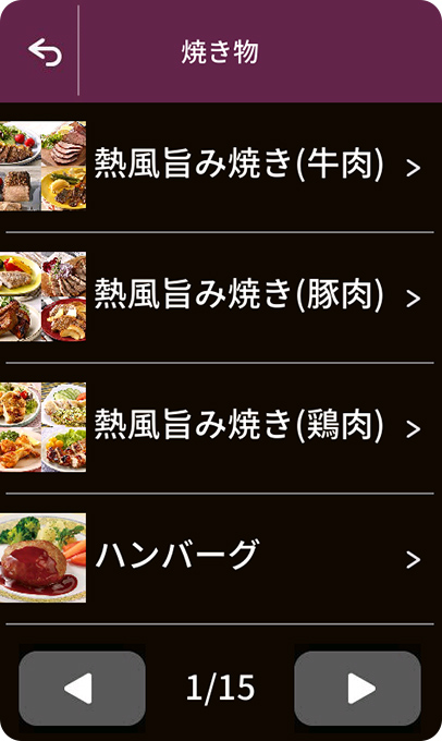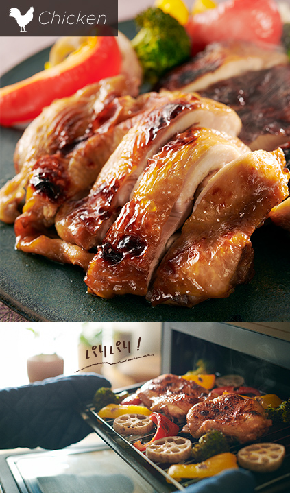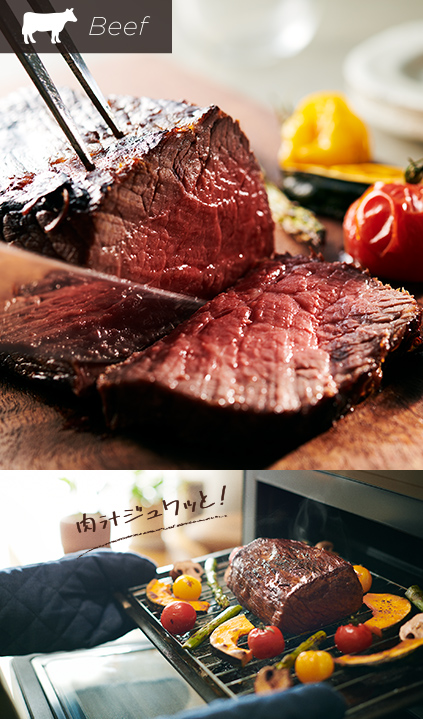 液晶画面からお肉の種類や形状を選択。分量にあわせて火加減がオートで調節されるため、焼き上がりもおまかせで。付け合わせの野菜も一緒に調理可能です。基本の味付けは塩・こしょうでOK。事前に下味をつけて焼き上げたり、ソースを作ってアレンジしたりなど、お好みの味をお楽しみいただけます。