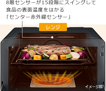 ②「センター赤外線センサー」が食品の表面温度を見極めるため、レンジ加熱で上昇する食品の温度を見て分量にあわせて調理ができる。最高 1,000W*1のレンジ加熱ですばやく食品の温度を上げる。