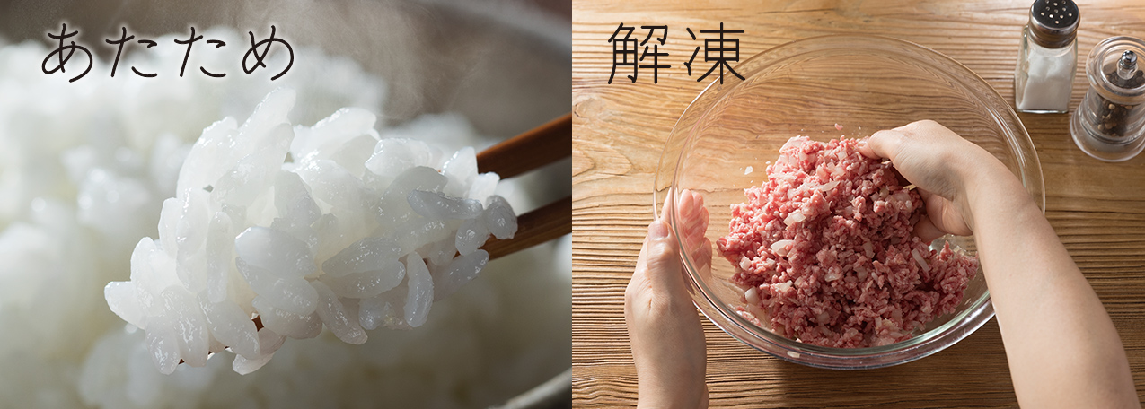 *2 食品の形状・庫内温度・容器等により仕上がりが異なります。薄切り肉など8種類の食品に対し解凍を行い、各々9点を温度測定。測定温度が一定差以内にあることを確認。