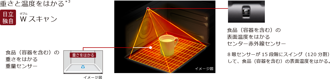 食品の重さと表面温度をはかって*3、適温*1にあたためます。