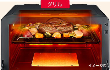 ③輻射熱と遠赤外線効果で加熱をはやめ、高温を維持。オーブンと過熱水蒸気の熱風でお肉を包み込むように焼き、肉汁を閉じ込める。