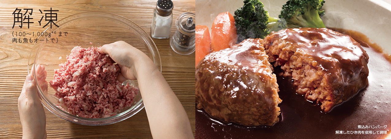 *2 食品の形状・庫内温度・容器等により仕上がりが異なります。薄切り肉など8種類の食品に対し解凍を行い、各々9点を温度測定。測定温度が一定差以内にあることを確認。