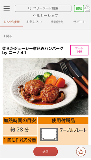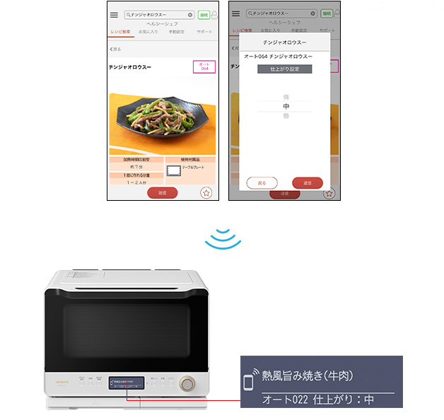 本体に搭載されていないレシピをアプリで配信します。配信レシピでレシピが増えるからレパートリーを増やしていけます。配信レシピはレンジで作れるクックパッドのレシピなどを配信します。お好みで選んで、レシピに記載されているレンジの出力(W)やオーブンの温度などの加熱のパワーや時間を本体に設定できます。