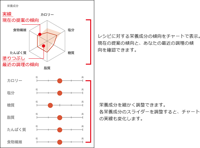 レシピに対する栄養成分の傾向をチャートで表示。