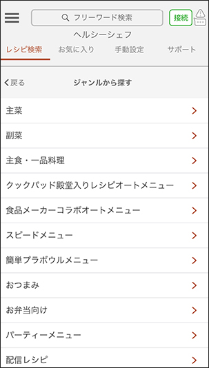 「ジャンルから探す」主菜や副菜、クックパッドや食品メーカーコラボオートメニューなどから検索できます。