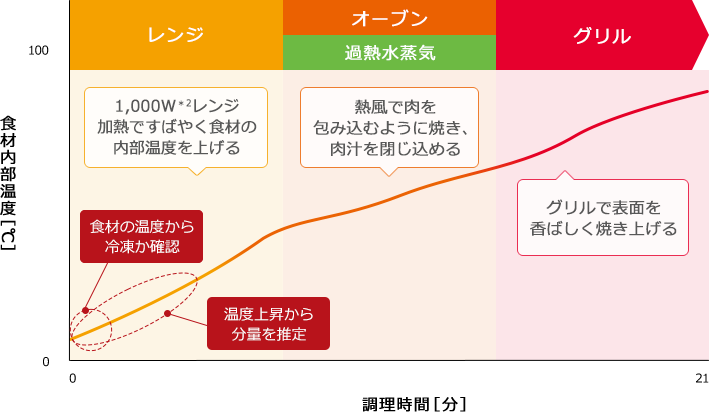 *2 オート調理のレンジ最高出力1,000Wは短時間出力機能であり、運転の途中で出力が自動的に切り替わります。オート調理の限定したメニューにのみ働きます。